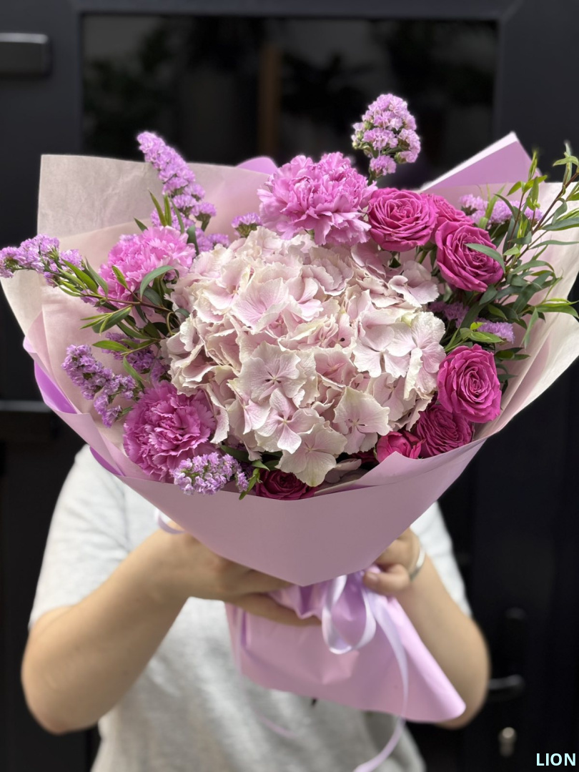 Пышная розовая гортензия нежного оттенка сочетается с изысканными цветами и свежей зеленью, создавая гармоничную композицию с лёгким ароматом весны. Идеален для выражения теплых чувств и заботы.