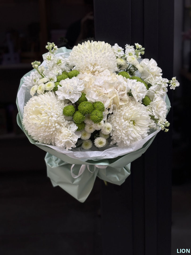 Нежные хризантемы «Антонов» и «Сантини» создают пышную основу, подчеркнутую сочной зеленью кустовых сортов. Роскошная гортензия и белые гвоздики придают композиции объем и яркий акцент. А волшебный, струящийся в вечернем воздухе аромат маттиолы добавляет букету неповторимое романтическое звучание, делая его идеальным подарком для особого момента.