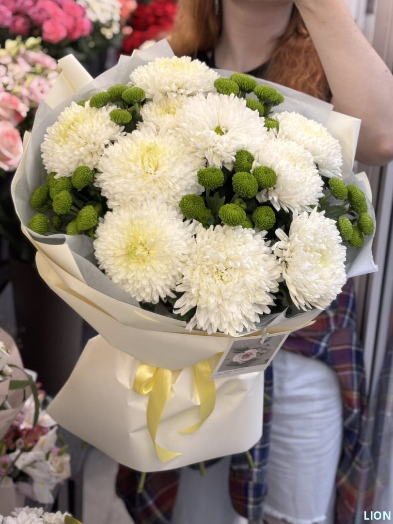 Этот букет — гимн гармонии и естественной красоте. Десять пышных хризантем «Антонов» нежного оттенка спелого яблока окружены свежей зеленью пяти кустовых соцветий. Лаконичная и выразительная композиция, где нежность встречается с силой природы, создает образец утонченного вкуса. Идеален для подарка, который говорит о вашем внимании к стилю и символизирует пожелание благополучия и спокойствия.