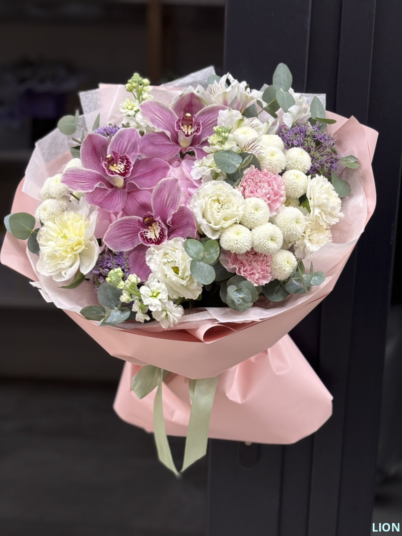 Этот букет — изысканная симфония фактур и ароматов. Роскошные цимбидиумы и пышный пион задают тон композиции, подчеркнутой воздушными соцветиями маттиолы и нежными гвоздиками. Сферические соцветия аллиума вносят графичный акцент, а эвкалипт завершает образ, создавая гармонию утонченной элегантности и нежного шарма.