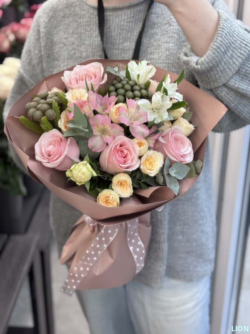 Серебристые шарики брунии придают этому букету фантазийную легкость и шарм. Они гармонично переплетаются с нежными розами и изящными альстромериями, создавая образ, одновременно нежный и графичный. Идеальное сочетание романтики и современного стиля.