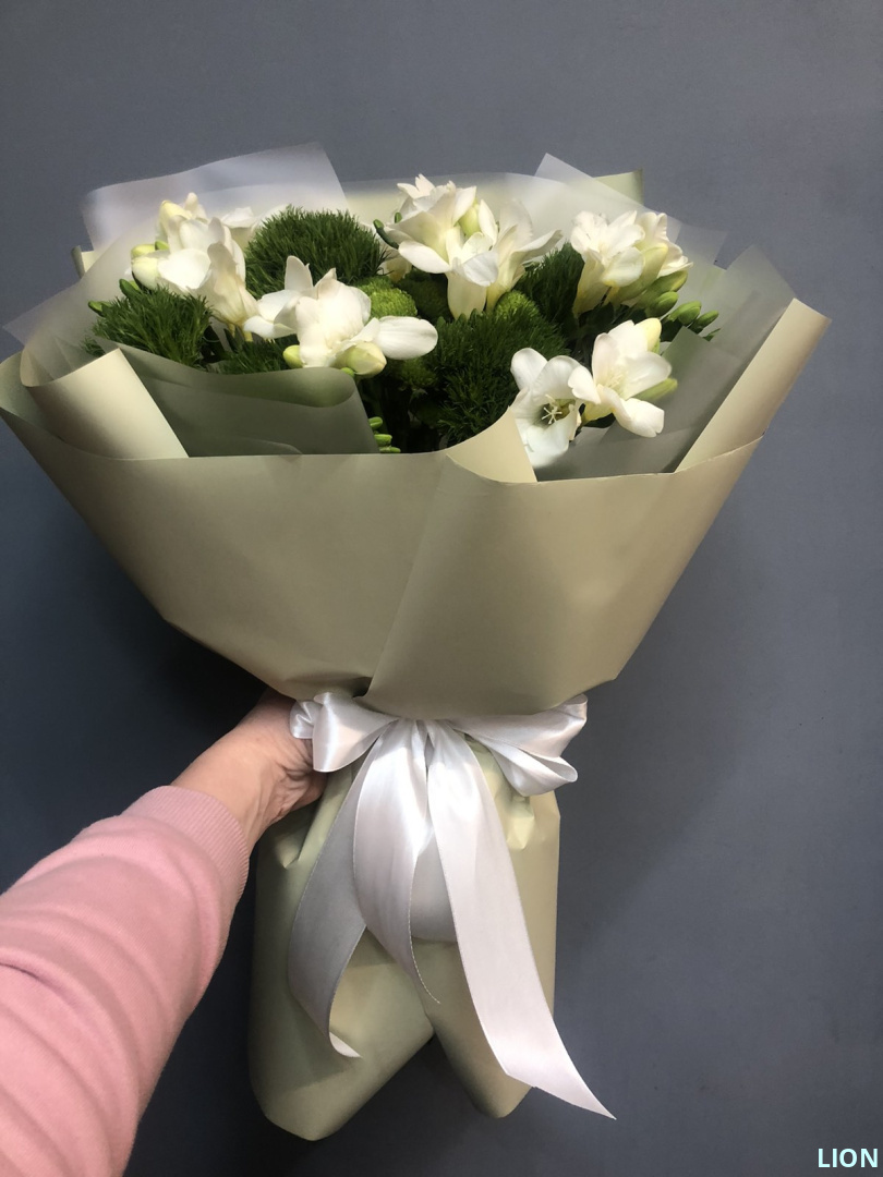 Смелый диалог фактур и оттенков! Нежные белые фрезии с изысканным ароматом, сочная гвоздика «Киви» и пышные зеленые хризантемы создают современную и графичную композицию. Этот букет — идеальный акцент для смелых решений, символ свежести чувств и индивидуального стиля. Выразите свои эмоции нестандартно.