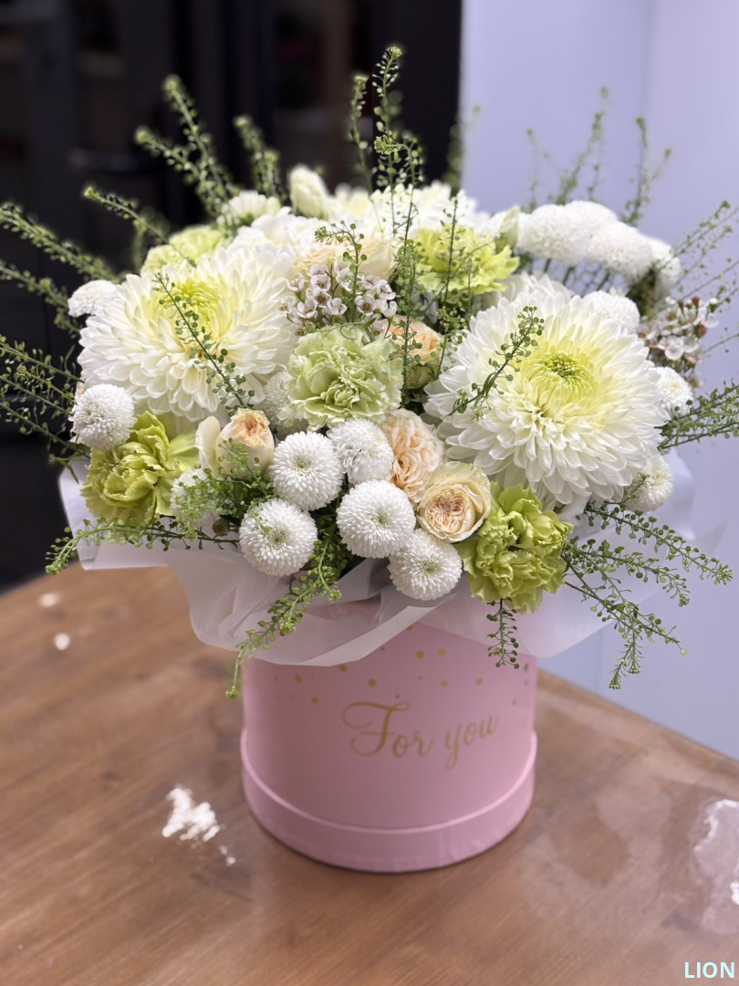 Взрыв сочных красок в элегантной шляпной коробке! Пышные хризантемы Антонов и нежные гвоздики создают щедрый объем, а кустовые розы и эустома добавляют королевского шарма. Изысканная тиласпия и хамелациум дарят композиции легкость и завершенность. Это идеальный подарок, наполненный солнцем и радостью.