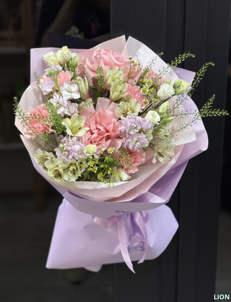 Ключевым элементом этого букета выступает роскошная французская роза. Её крупный бутон, окрашенный в нежные розовые тона, символизирует изящество и гармонию. Окруженная облаком воздушной эустомы, душистой маттиолы и декоративной зелени, она создает изысканную композицию, полную очарования и трогательной нежности. Идеальный способ выразить самые глубокие чувства.