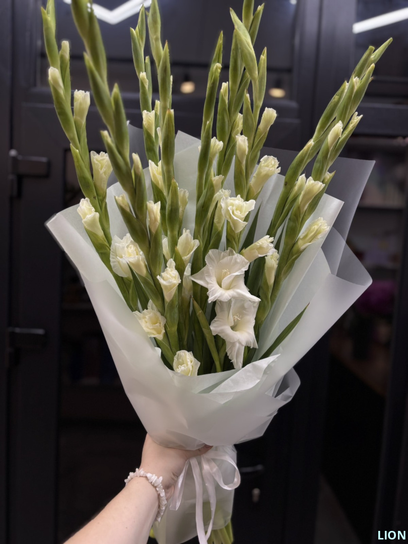 Букет из белых гладиолусов — воплощение чистоты, достоинства и благородства. Высокие изящные стебли и нежные лепестки создают ощущение лёгкости и торжества. Такая композиция станет элегантным подарком, выражающим искренние чувства, уважение и восхищение.