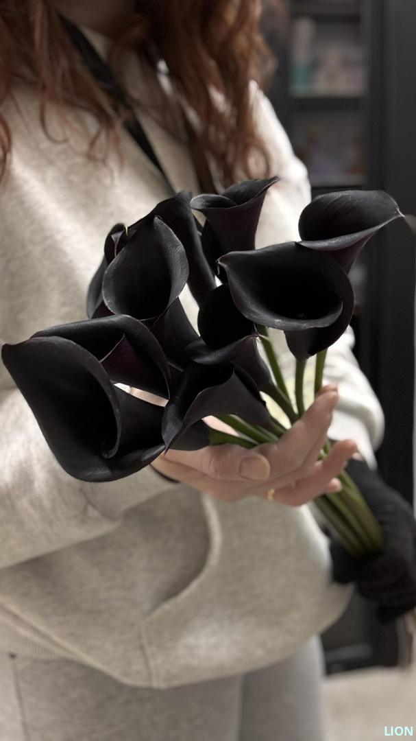 Каллы сорта odessa темного насыщенного фиолетового цвета - цвета чернослива. Длинна цветка со стеблем 60 см, высота бутона 7,5-8 см.