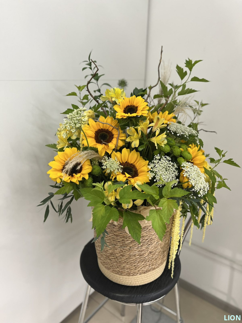 Корзина с подсолнухами — щедрый подарок самого лета. Восемь золотистых солнц в окружении нежных альстромерий и ажурного филингрина создают образ деревенского уюта и тепла. Дополненные сезонной зеленью, эти цветы в плетеной корзине дарят ощущение изобилия и радости.