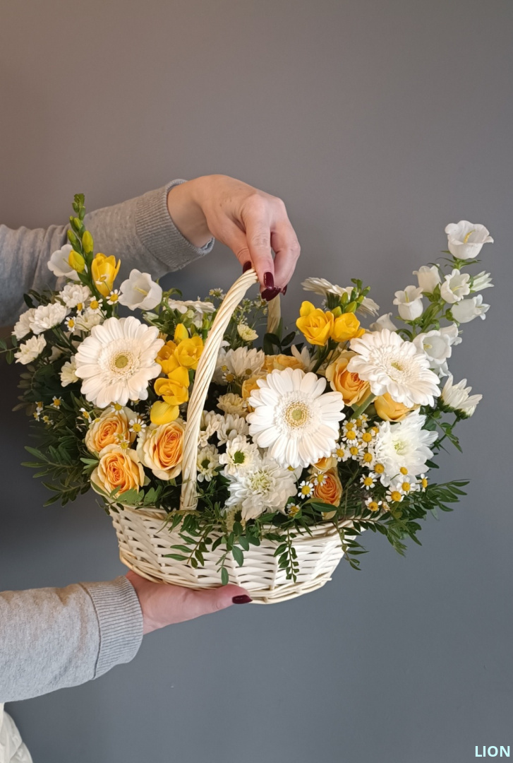 Элегантная симфония в бело-желтой гамме. Величественные герберы и изящные фрезии гармонируют с розами и хризантемами, создавая богатую текстуру. Ажурный танацетум и колокольчики придают воздушность, напоминая цветущий оазис под щедрым солнцем.