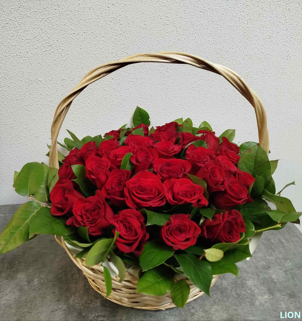 Размеры 45х35. Классические красные розы в необычном и оригинальном оформлении. Композиция завораживает своей яркостью и красотой. Красный - символ любви и страсти, такой букет станет отличным решением признаться в своих чувствах. Зелень салала выгодно оттеняет яркость бутонов, создавая неповторимый и красочный контраст цвета. А корзина, в которой собран букет, добавляет ему изыска и уникальности.