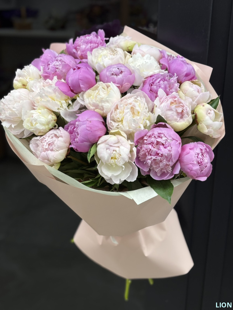 Двадцать пять пионов в роскошном дуэте. Игра контрастов: нежные пастельные тона и сочные яркие акценты. Пышные бутоны создают динамичную и гармоничную композицию, полную радости и изящества. Букет-настроение, способный рассказать целую историю.