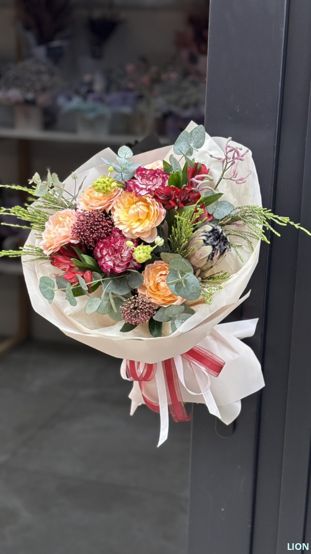 Этот букет — смелое путешествие в мир экзотики. В его сердце — царственная протея, чей фантастический бутон очаровывает воображение. Её мощную графику мягко оттеняют нежные соцветия и ажурная зелень, создавая гармоничный и запоминающийся образ вне времени и тенденций.