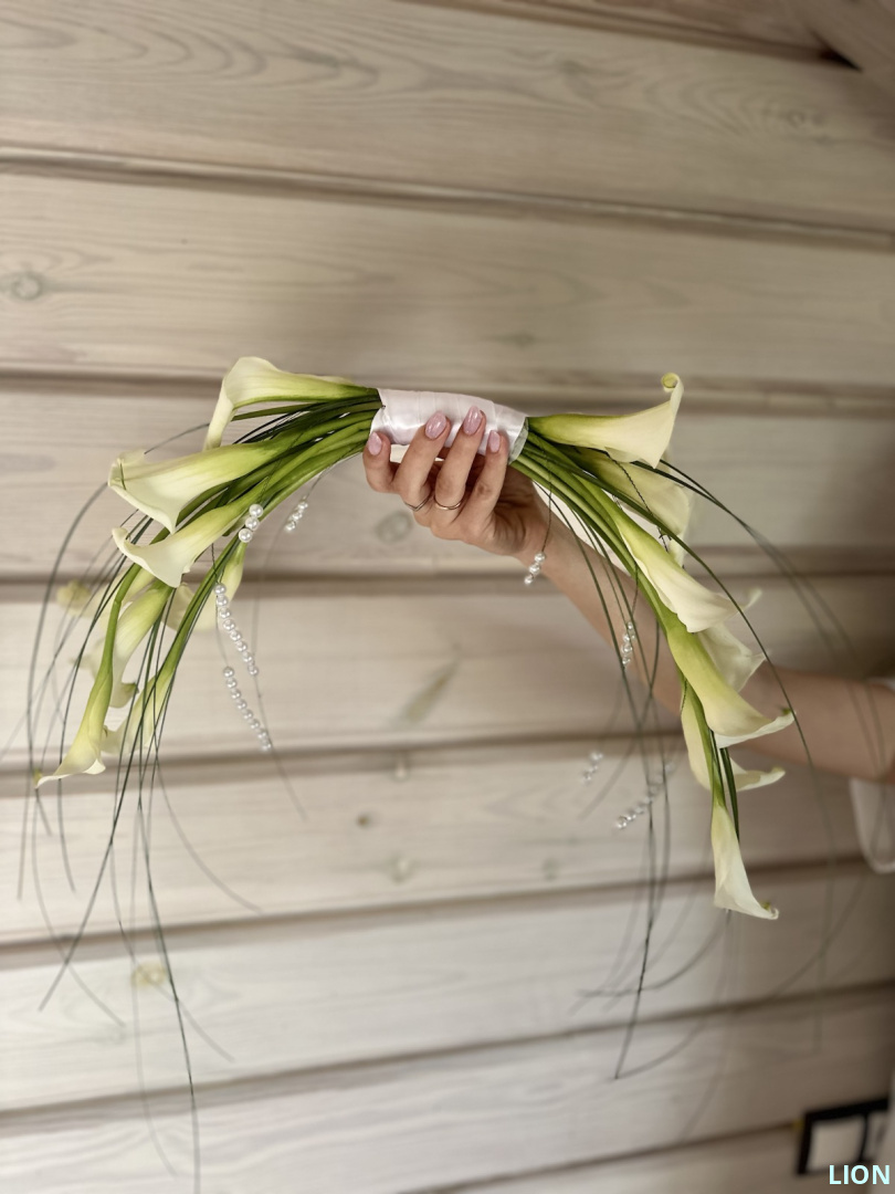 Белые каллы 17, берграсс, бусины (декор), сборка.
