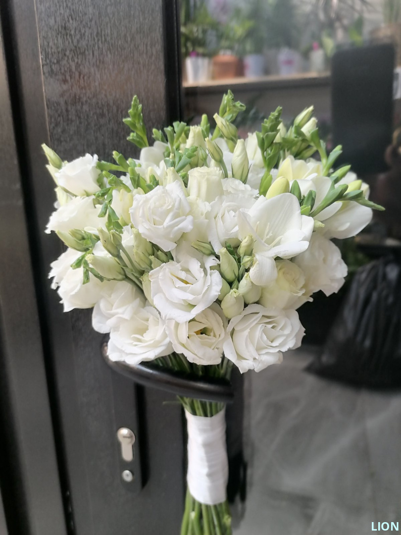 фрезия белая 10 шт., эустома белая 4 шт., лента.
