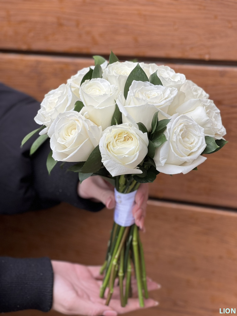 Симфония чистоты и верности. Каждая из пятнадцати белых роз — обещание вечной преданности, а графичная зелень рускуса олицетворяет прочный союз. Этот лаконичный букет говорит о главном без лишних слов: ваша любовь — навсегда!