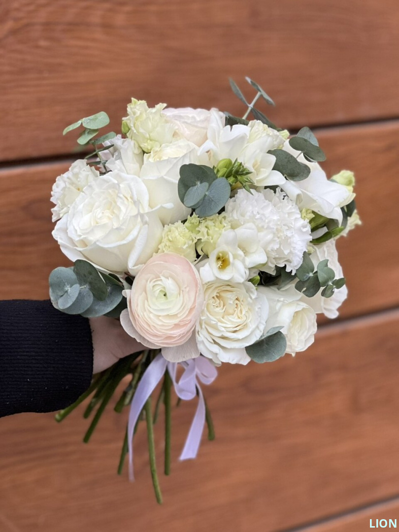 Изысканная композиция, сотканная из нежности. Роскошные ранункулюсы и классические розы переплетаются с кружевом фрезий и эустомы, создавая ощущение воздушного кружева. Легкие веточки эвкалипта завершают этот трогательный образ, полный изящества и шарма.