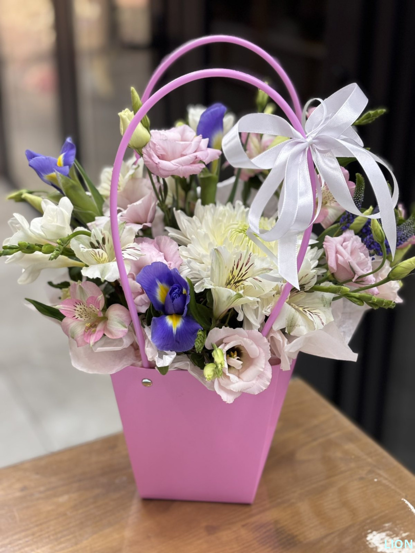Очаровательная композиция в виде сумочки, сотканная из нежности и изящества. Грациозные ирисы, ароматные фрезии и трогательные альстромерии сплетаются в единую гармонию. Шелк эустомы и бархат хризантемы делают этот цветочный аксессуар воплощением романтики.