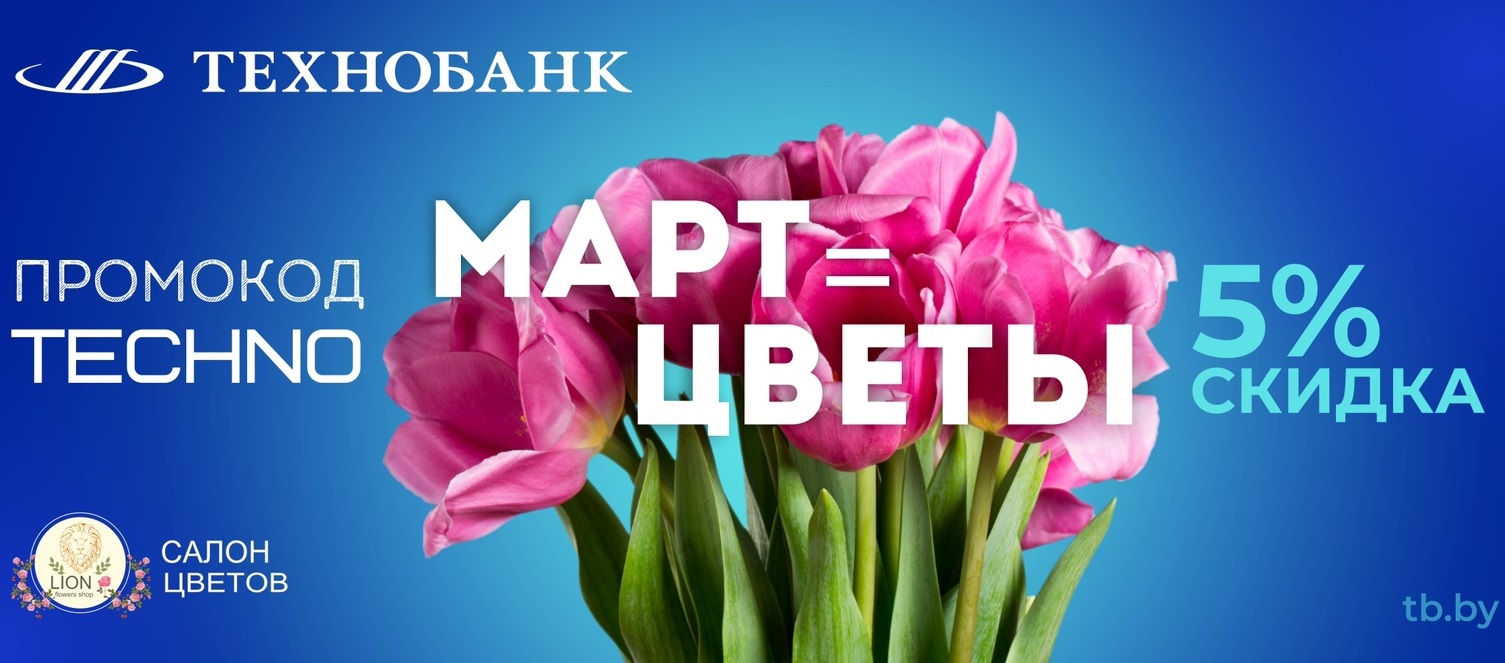 Наша компания, совместно с Технобанк, дарит скидку в 5% на все цветы и букеты для обладателей пластиковых карт банка!